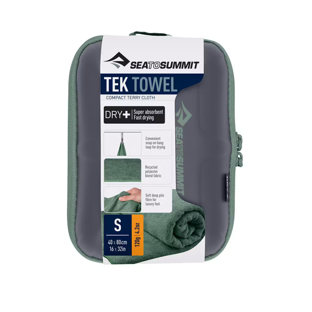 Das Sea to Summit Tek Towel in Salbei ist ein luxuriöses Mikrofaserhandtuch, das sich weich anfühlt, schnell trocknet und viel Wasser aufnimmt – perfekt für Camping, Reisen oder Sport.