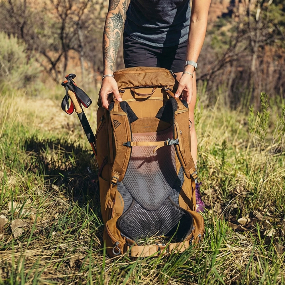 Het hart van de Maven 58 is het innovatieve draagsysteem dat speciaal is afgestemd op de vrouwelijke anatomie. De heupband en schouderbanden zijn zo gevormd dat ze perfect aansluiten, terwijl het rugpand volledig verstelbaar is voor een maatwerk pasvorm. Dankzij de flexibele panelen in de heupband beweegt de rugzak natuurlijk mee met je heupen en lichaam, wat zorgt voor stabiliteit op ongelijk terrein en energiebesparing tijdens lange dagen. Het rugpaneel is voorzien van een gespannen 3D-mesh constructie. Dit zorgt ervoor dat er altijd een luchtstroom is tussen je rug en de tas, waardoor je zelfs tijdens inspannende beklimmingen koel en droog blijft.